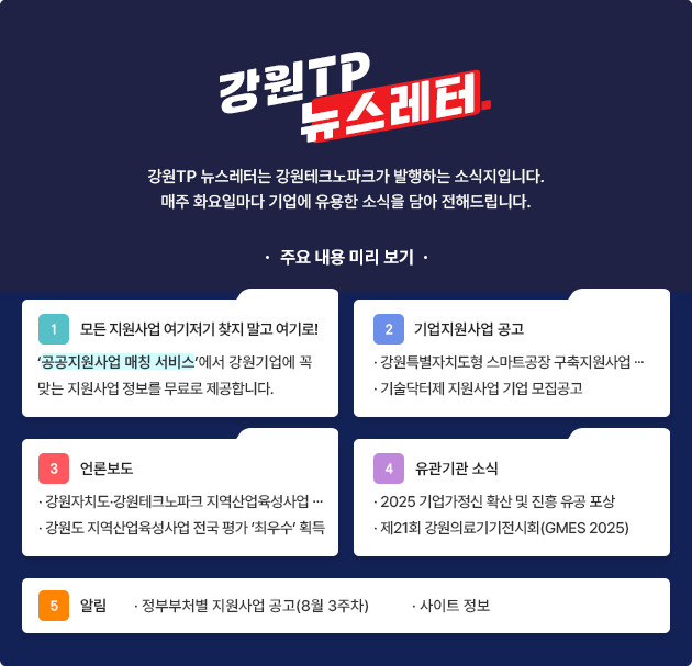 (재)강원테크노파크는 본 사이트에서 게시된 이메일 주소가 전자우편 수집 프로그램이나 그 밖의 기술적 장치를 이용하여 무단으로 수집되는 것을 거부하며, 이를 위반할 시 종보통신망법에 의해 형사처벌됨을 유의하기시 바랍니다.