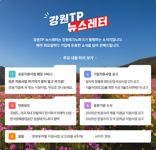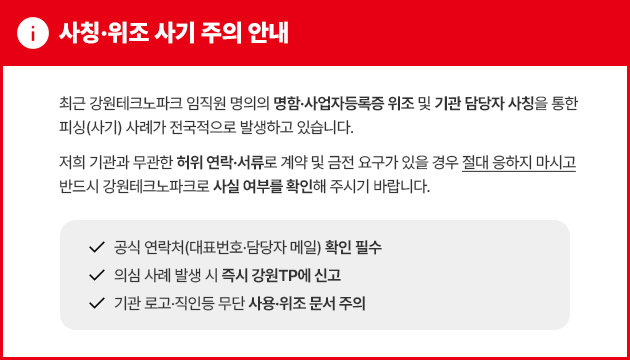 (재)강원테크노파크는 본 사이트에서 게시된 이메일 주소가 전자우편 수집 프로그램이나 그 밖의 기술적 장치를 이용하여 무단으로 수집되는 것을 거부하며, 이를 위반할 시 종보통신망법에 의해 형사처벌됨을 유의하기시 바랍니다.