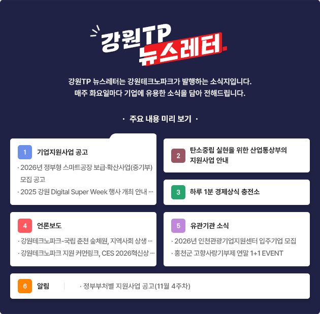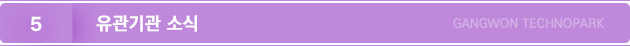 (재)강원테크노파크는 본 사이트에서 게시된 이메일 주소가 전자우편 수집 프로그램이나 그 밖의 기술적 장치를 이용하여 무단으로 수집되는 것을 거부하며, 이를 위반할 시 종보통신망법에 의해 형사처벌됨을 유의하기시 바랍니다.