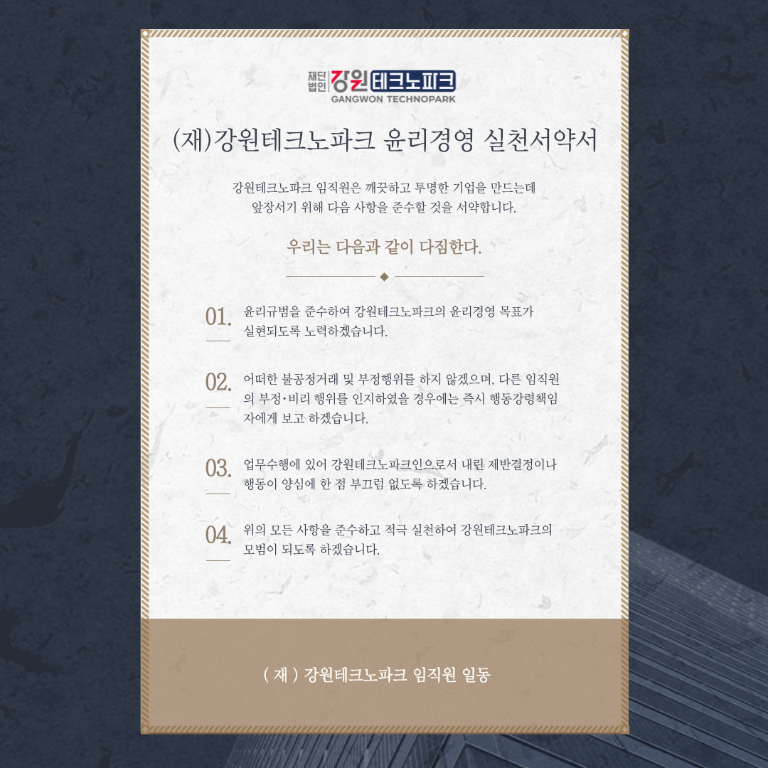우리 강원테크노파크는 전 임직원이 투명하고 공정한 업무처리와 청렴한 윤리를 바탕으로 강원지역 산ㆍ학ㆍ연ㆍ관의 유기적인 협력체제를 구축하여 지역전략산업의 기술고도화와 기술집약적 기업의 창업을 촉진하고 지역경제활성화와 국가경제발전을 선도한다. 이에 우리는 모든 임직원이 지켜야 할 올바른 행동과 가치판단의 기준으로 윤리헌장을 제정하여 경영 녹색화의 길로 나아간다.